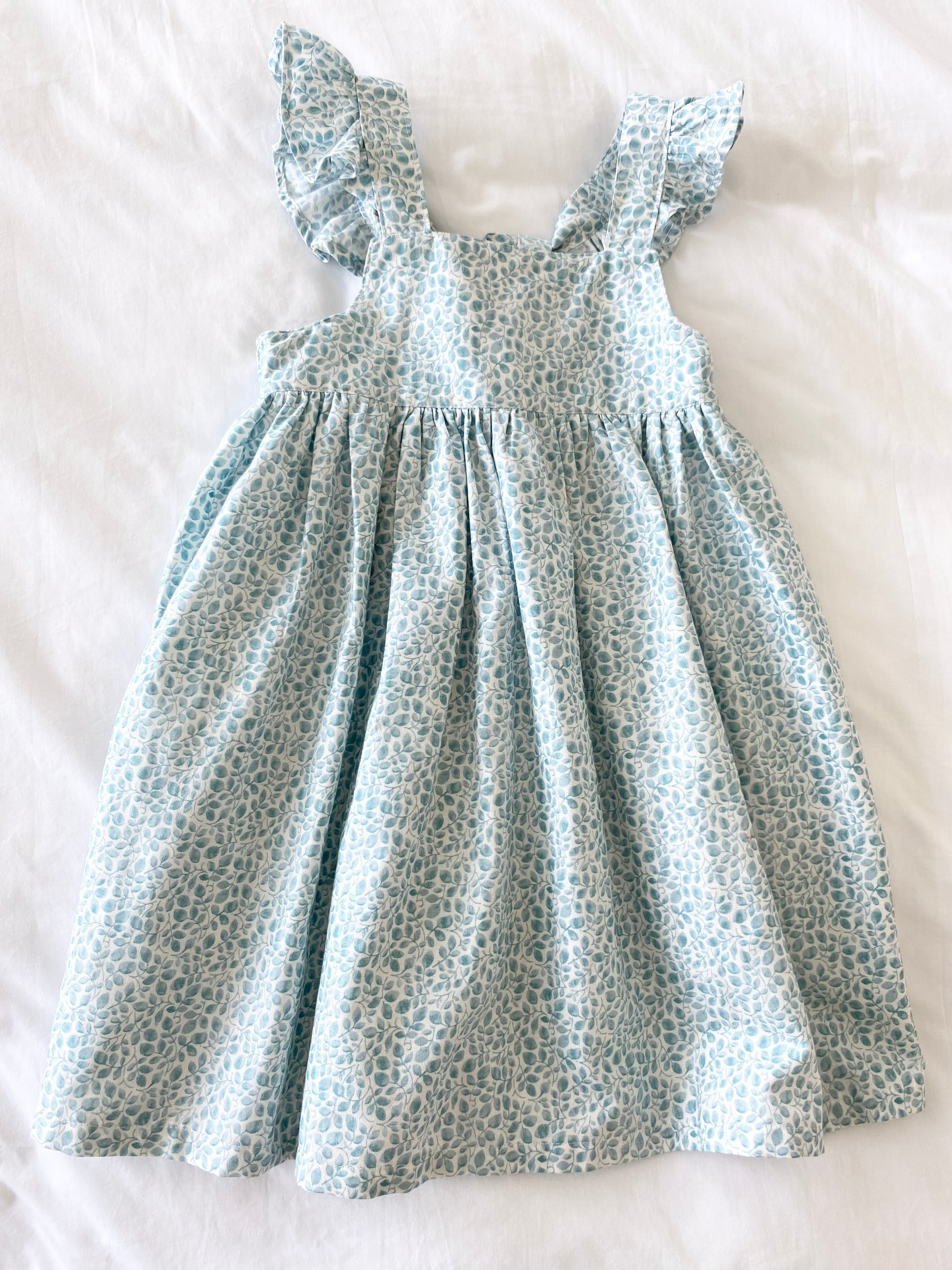 The Narnie and me Marigold dress is made in a blue liberty fabric. 100% cotton.