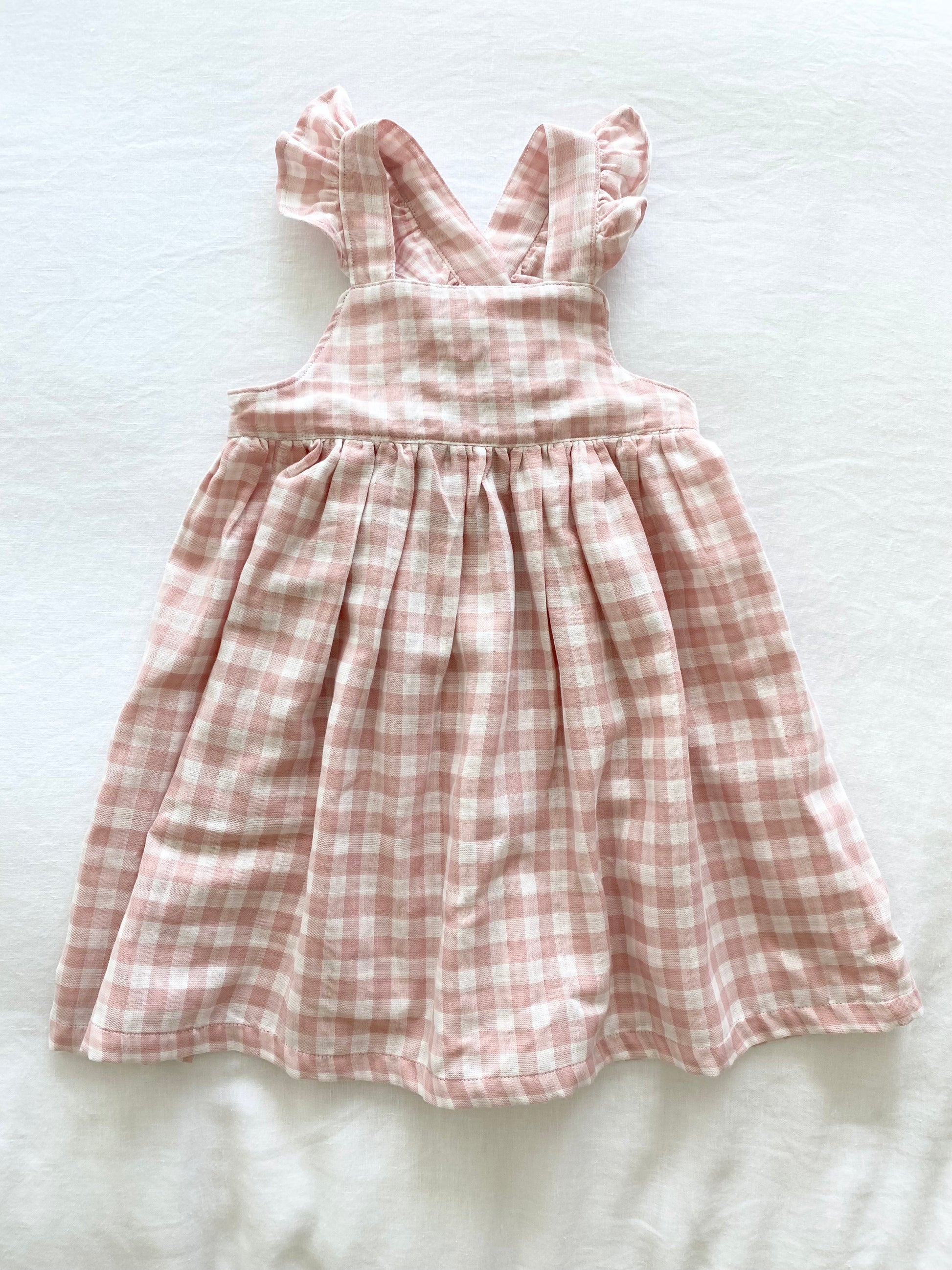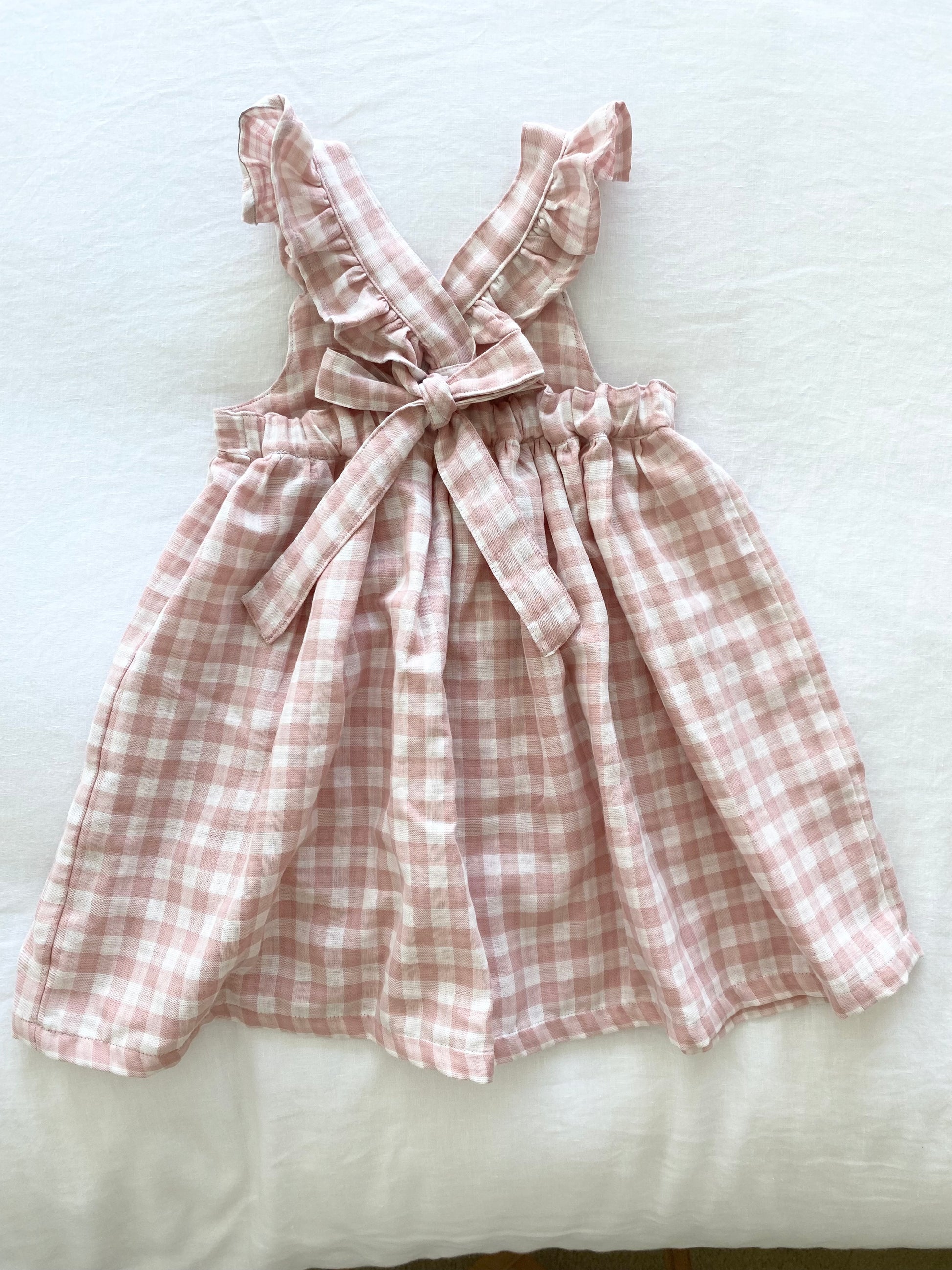 The Narnie and me Marigold dress is made in a soft double cloth pale pink gingham cotton. The lightweight fabric is idyllic for the hot summer months. The perfect seasonal dress designed to be worn all year round as is or with layers. A great staple for your child’s wardrobe that extends to accommodate with your little one’s growth.