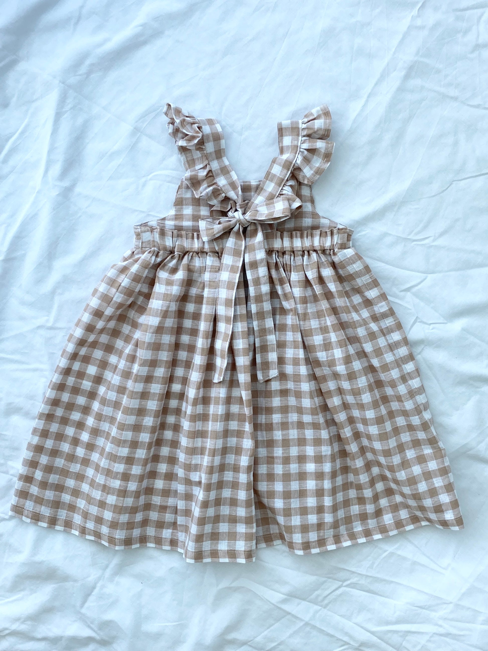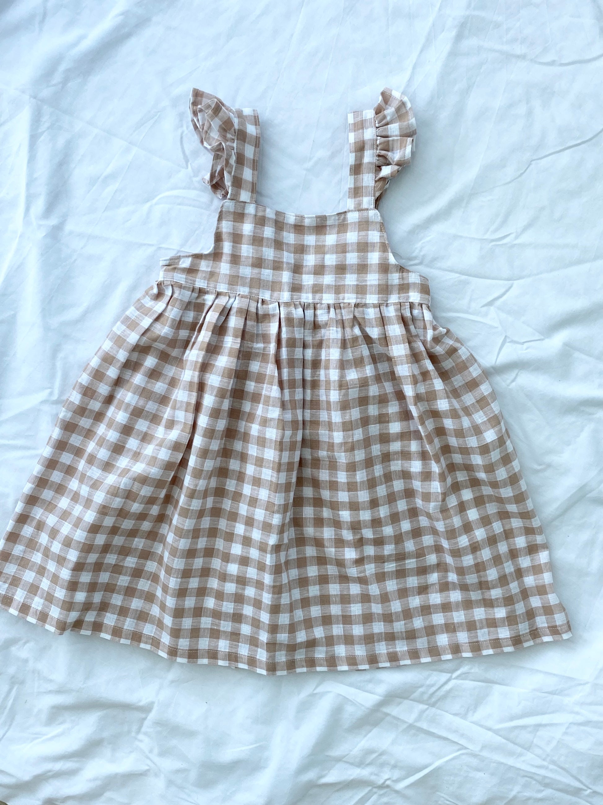 The Narnie and me Marigold dress is made in a pine coloured gingham cotton. The perfect seasonal dress designed to be worn all year round as is or with layers. A great staple for your child’s wardrobe that extends to accommodate with your little one’s growth.