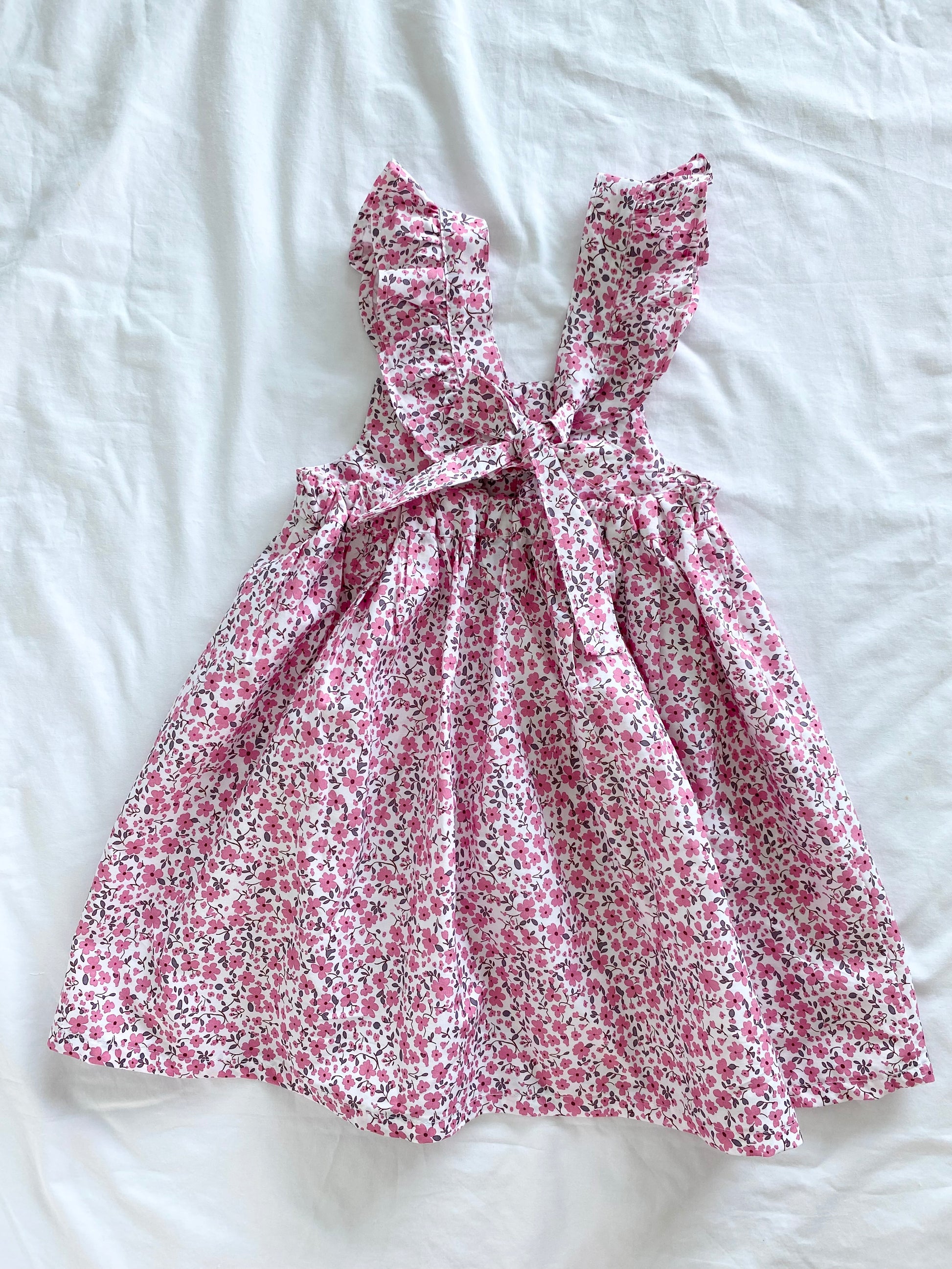 The Narnie and me Marigold dress is made in a cool pink floral poplin cotton fabric. The perfect seasonal dress designed to be worn all year round as is or with layers. A great staple for your child’s wardrobe that extends to accommodate with your little one’s growth.