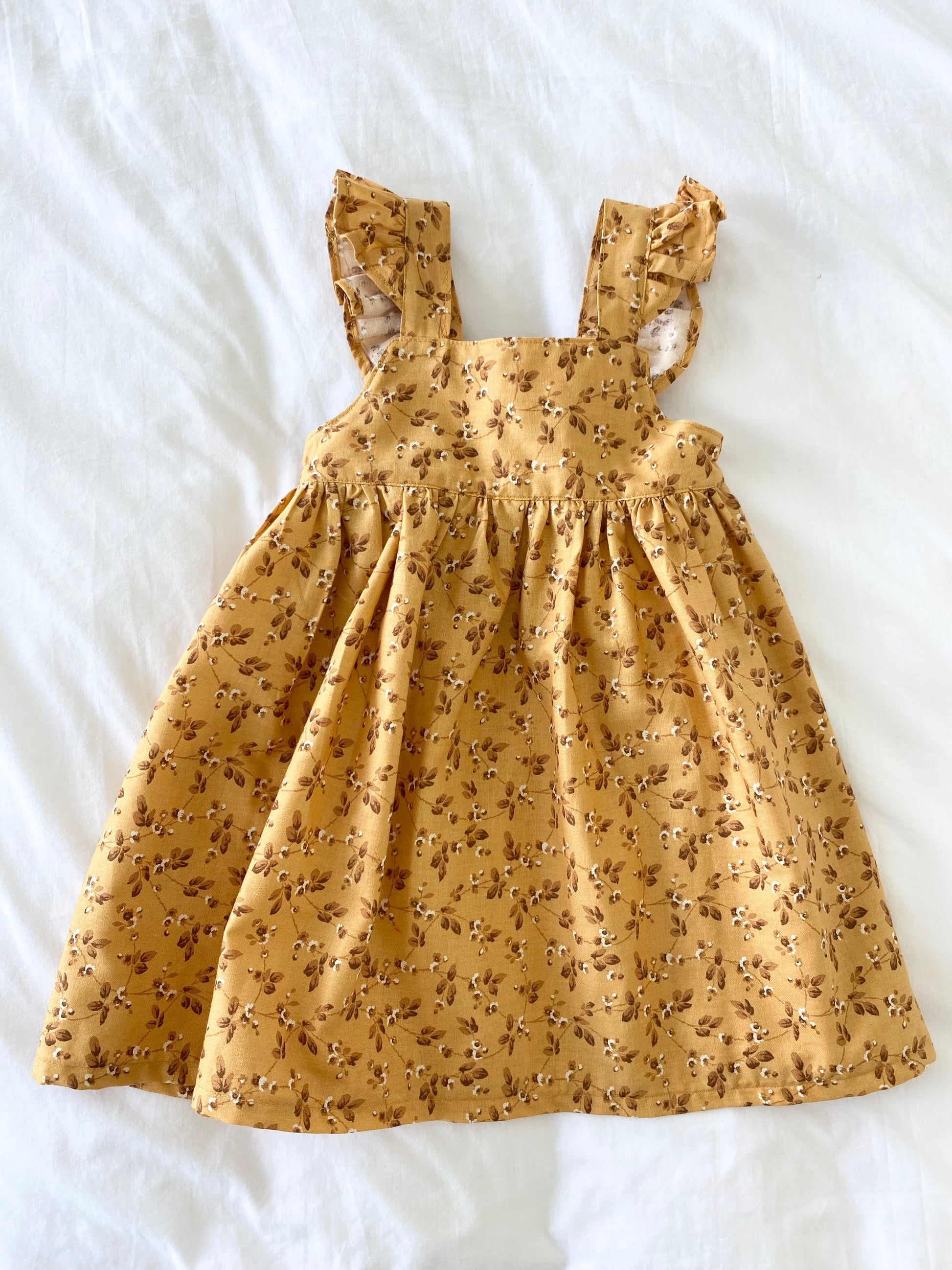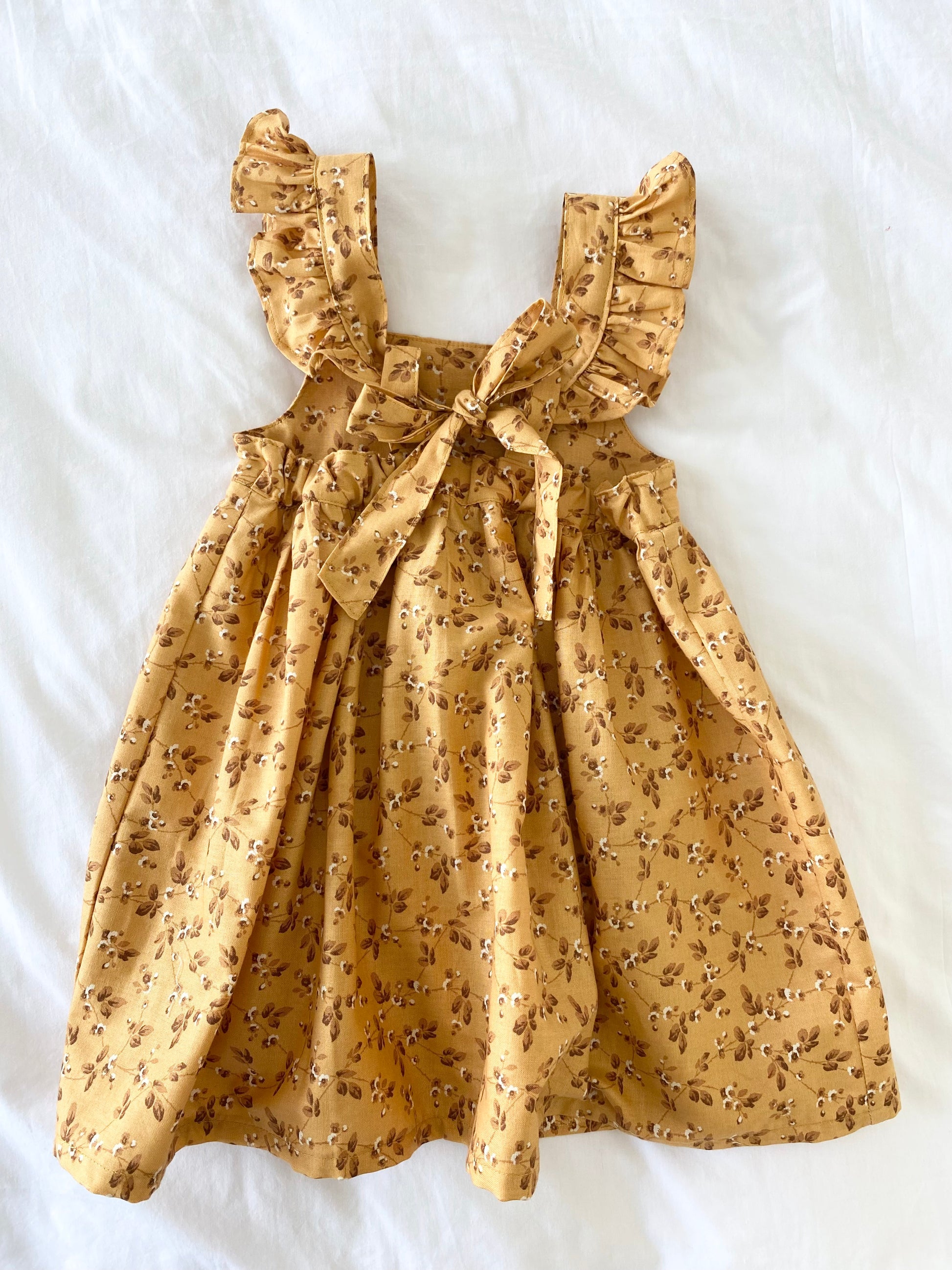 The Narnie and me Marigold dress is made in a tan floral fabric. 100% cotton.