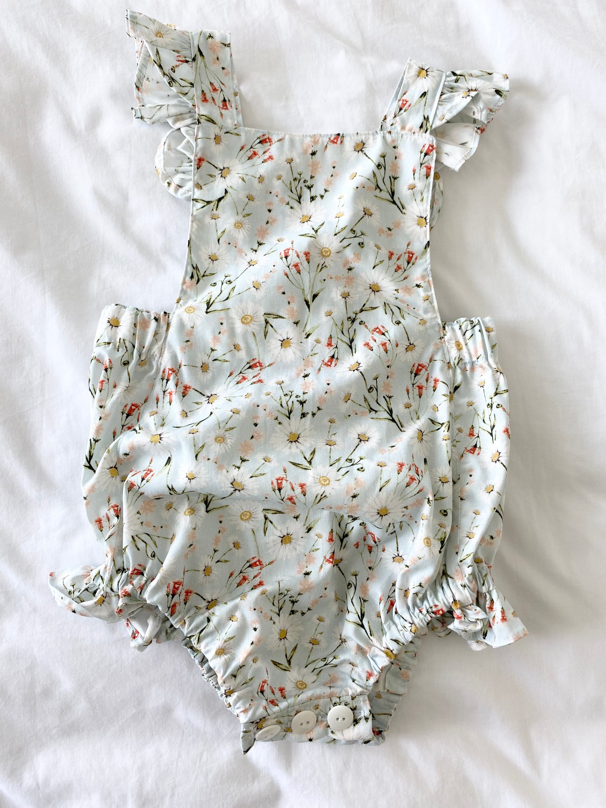 The Narnie and me Marigold Romper Daisy Print pale blue is made in a Japanese poplin cotton. 100% cotton.
