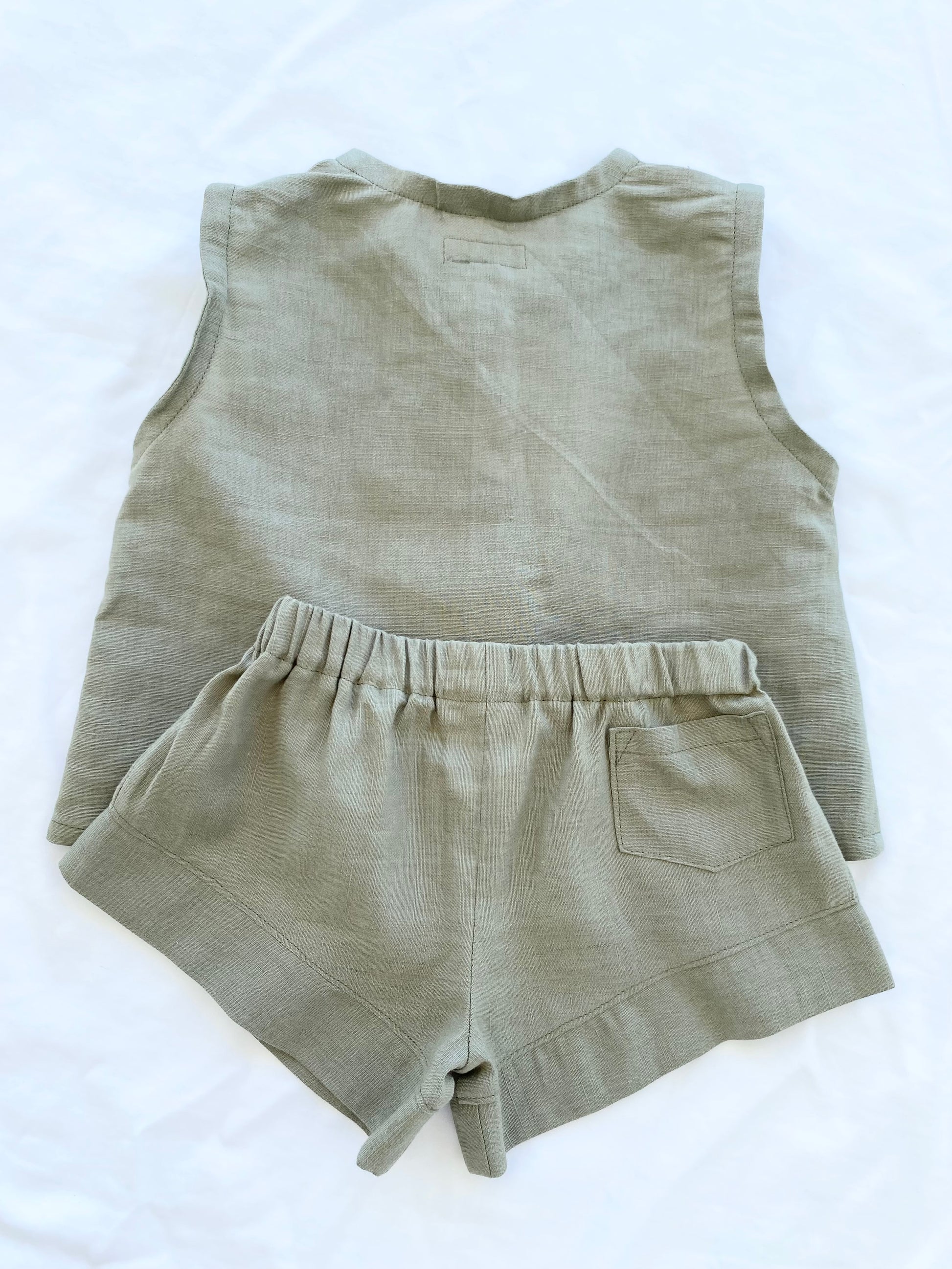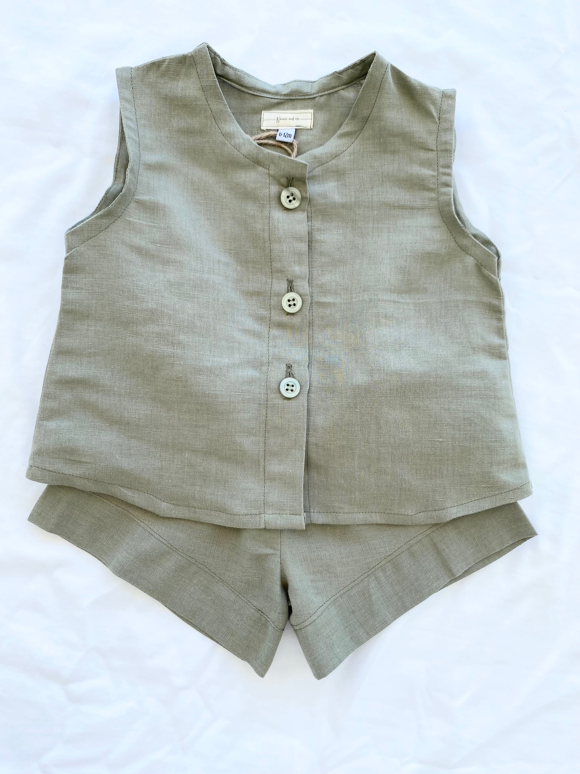 A two-piece set featuring a sleeveless, 3 buttoned top worn with an elastic-waist and cuffed boy leg short. The short set can be worn as a set or as separates.