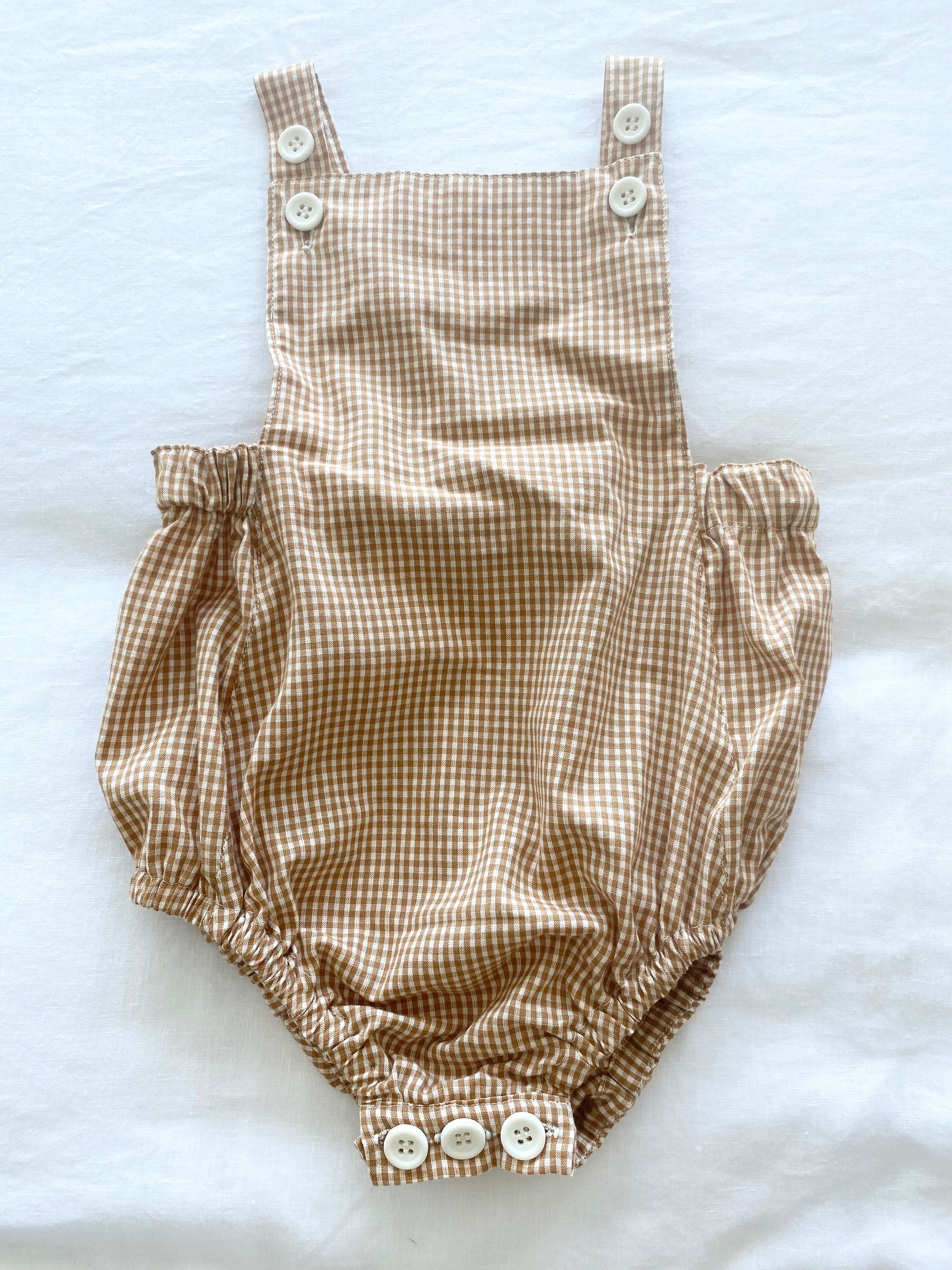 The Narnie and me Unisex Romper is made in a pecan coloured small square cotton gingham. A full bloomer pant with a strap bib front. The straps have two buttons on each strap to extend with baby’s growth. The rompers have button holed access for easy toddler/baby nappy change with elasticised leg openings.
