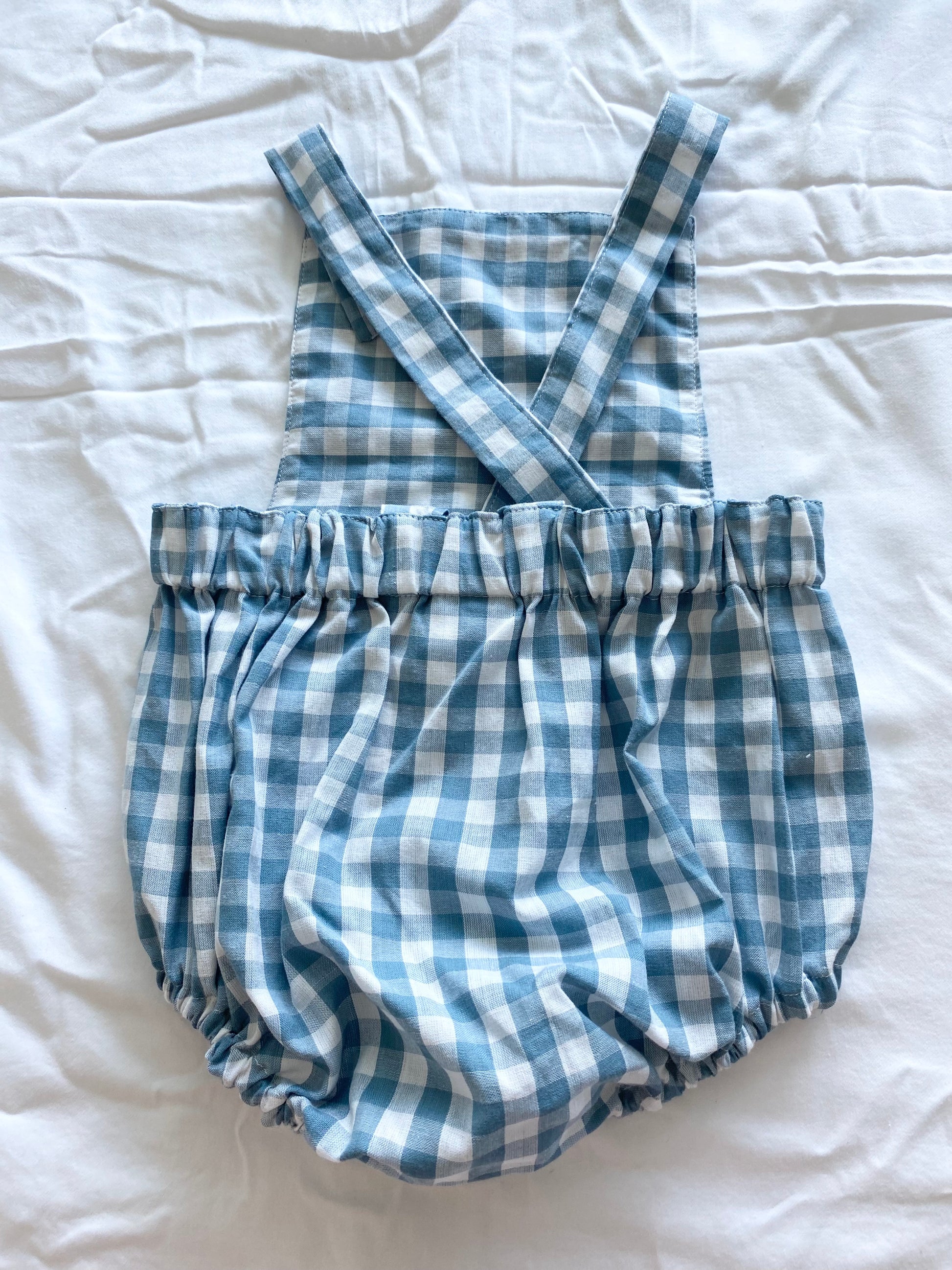 The Narnie and me Unisex Romper is made in egg blue cotton gingham. A full bloomer pant with a strap bib front. The straps have two buttons on each strap to extend with baby’s growth. The rompers have button holed access for easy toddler/baby nappy change with elasticised leg openings.