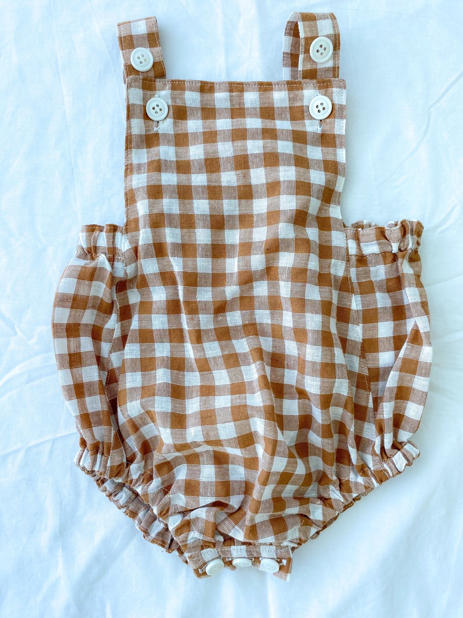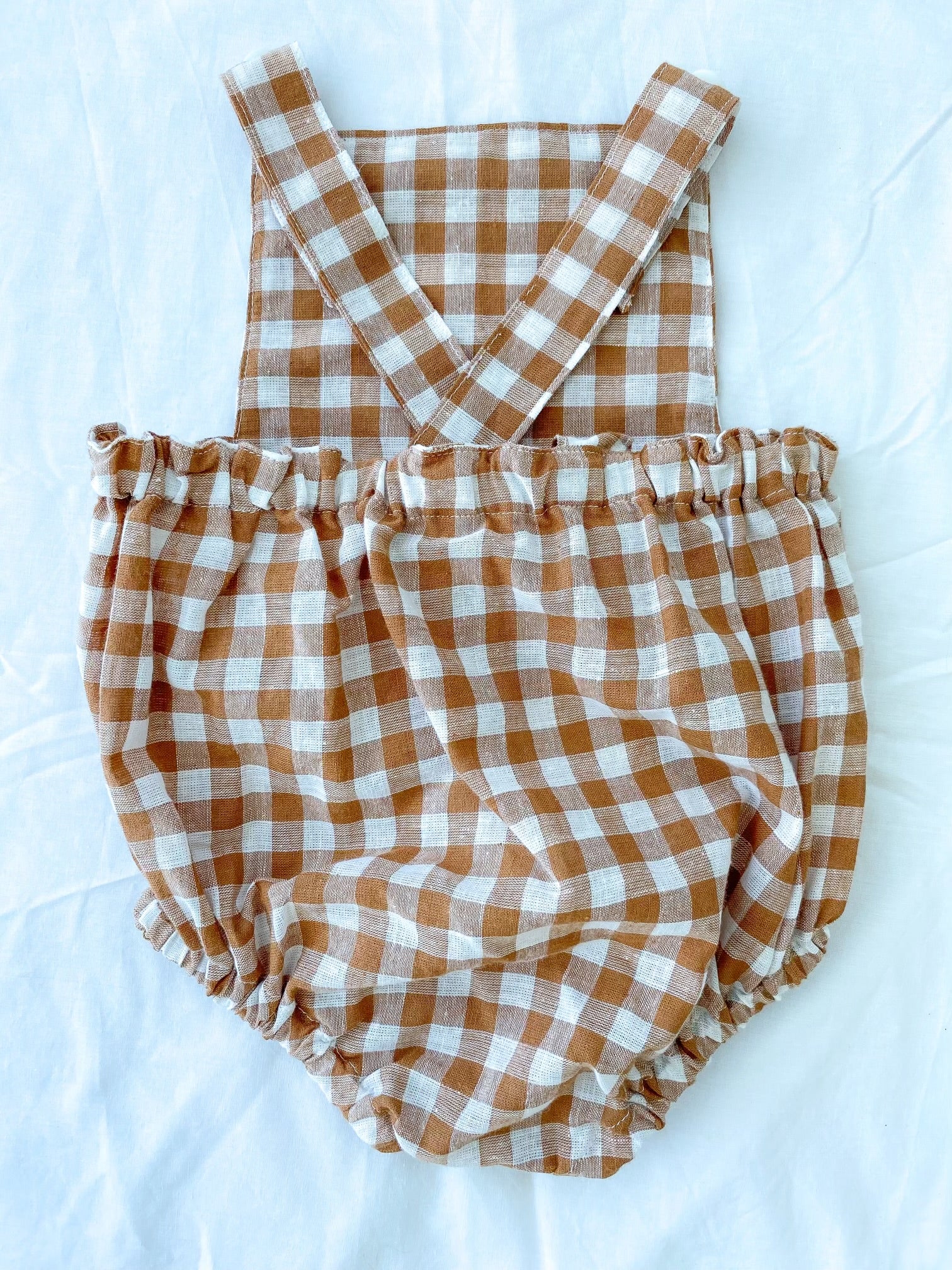 The Narnie and me Unisex Romper is made in a caramel cotton gingham. A full bloomer pant with a strap bib front. The straps have two buttons on each strap to extend with baby’s growth. The rompers have button holed access for easy toddler/baby nappy change with elasticised leg openings.