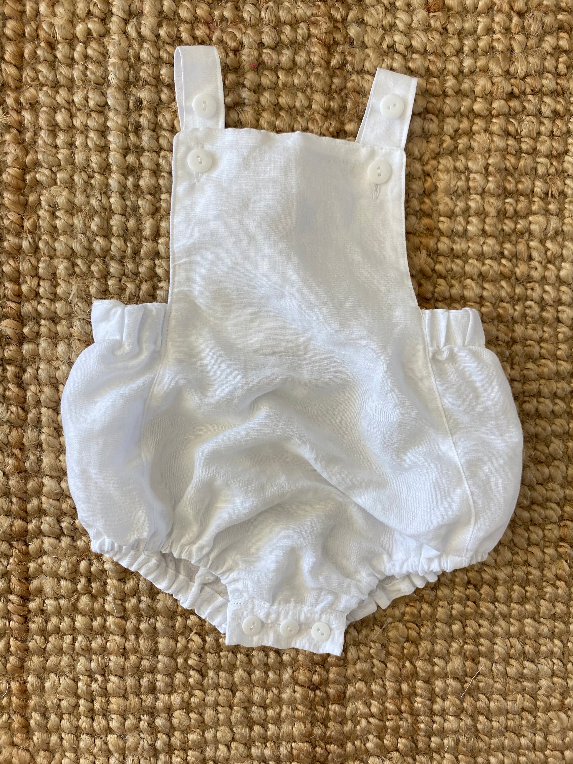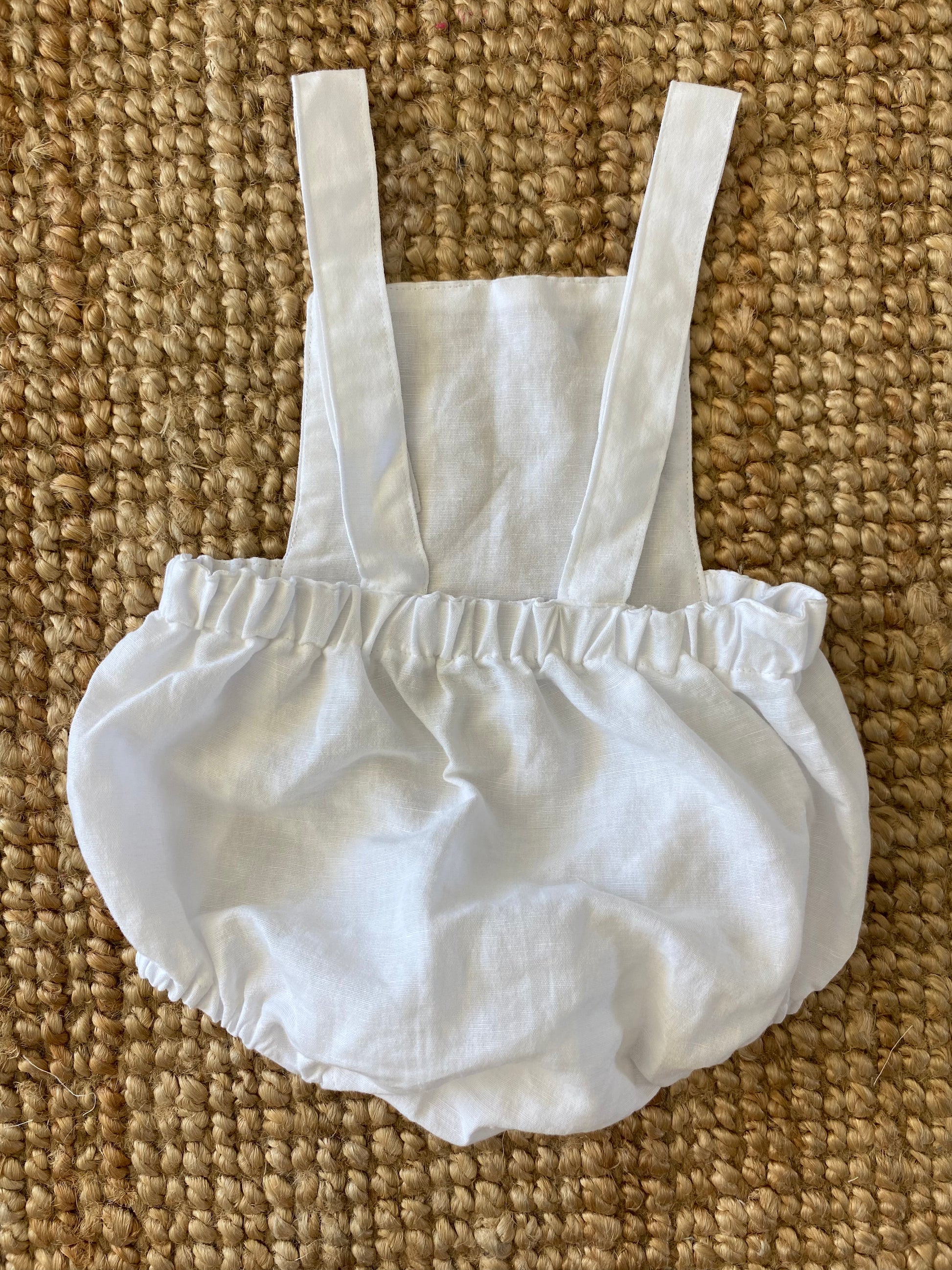 The Narnie and me Unisex Romper is made in a crisp white linen cotton fabric. A full bloomer pant with a strap bib front. The straps have two buttons on each strap to extend with baby’s growth. The rompers have button holed access for easy toddler/baby nappy change with elasticised leg openings.