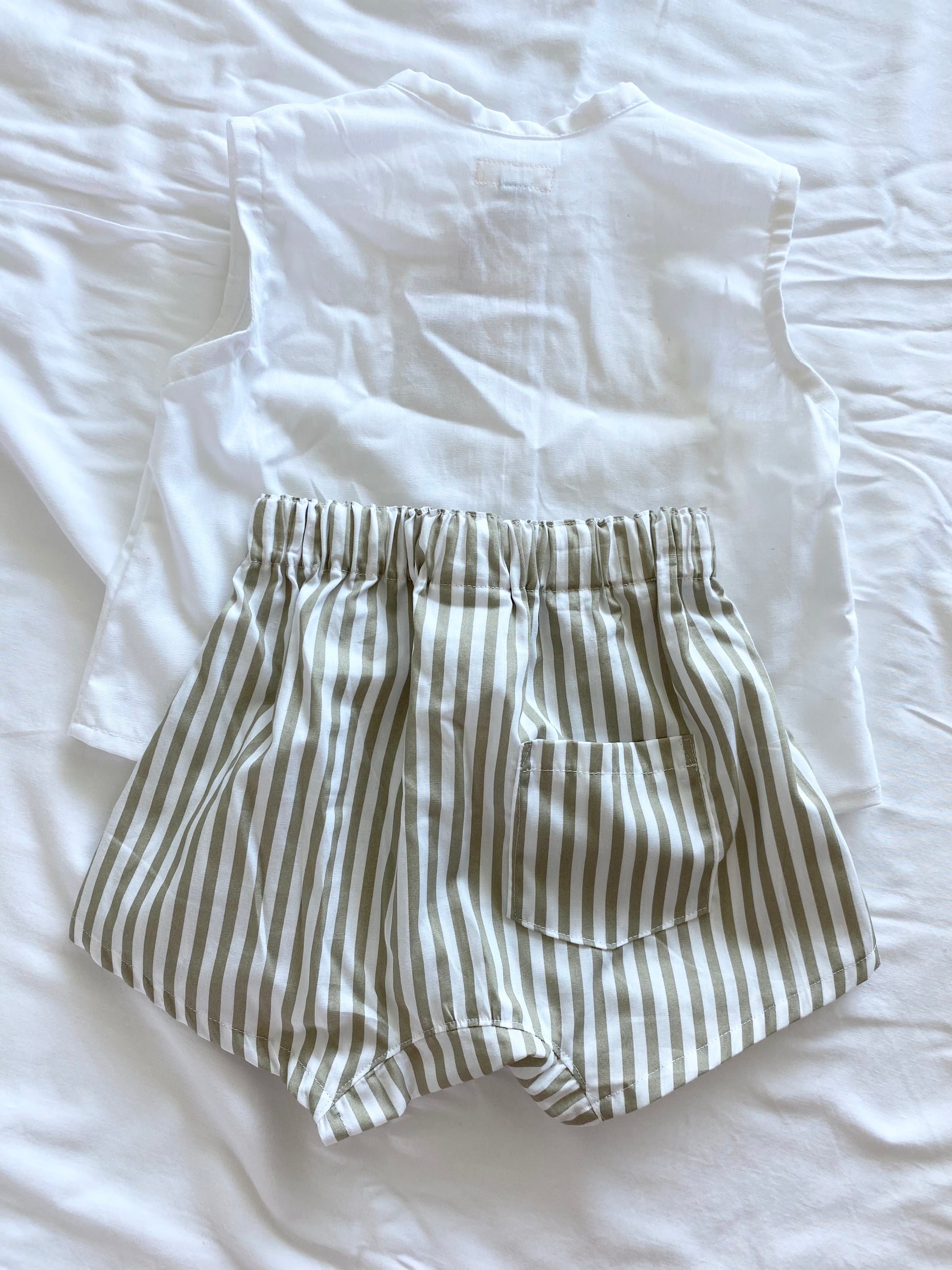ZaiZai Baby Short Set - 100% Cotton - White Buttoned Top with Khaki Stripe Drawstring Short